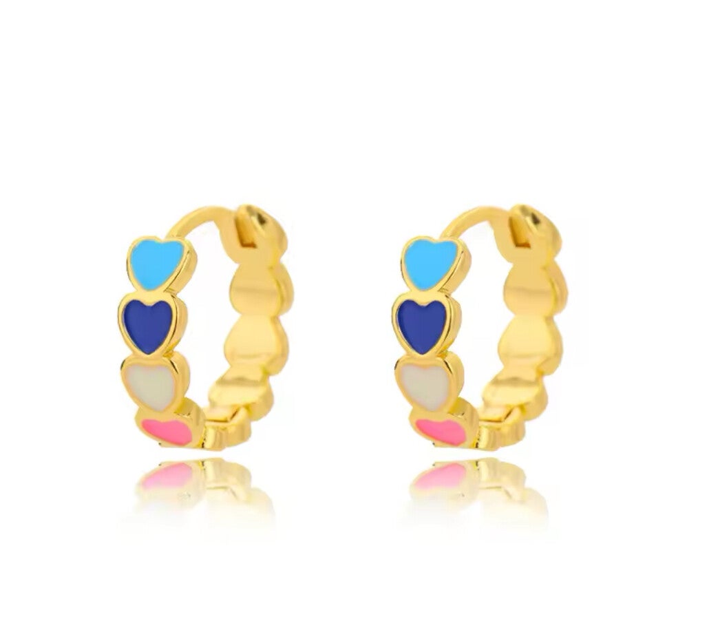 Leuke ronde oorbellen voor kinderen, versierd met hartjes in verschillende vrolijke kleuren. Verkrijgbaar in zilver of goudkleurig, perfect voor dagelijks dragen en feestelijke momenten. Gemaakt van 925 sterling zilver.